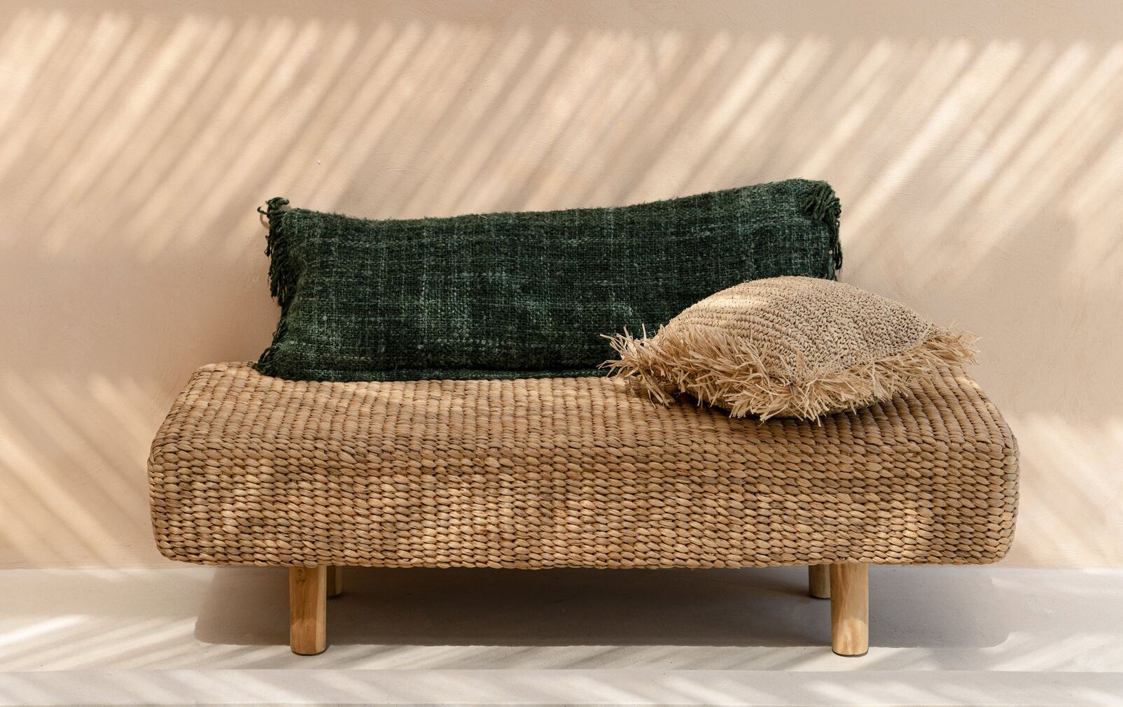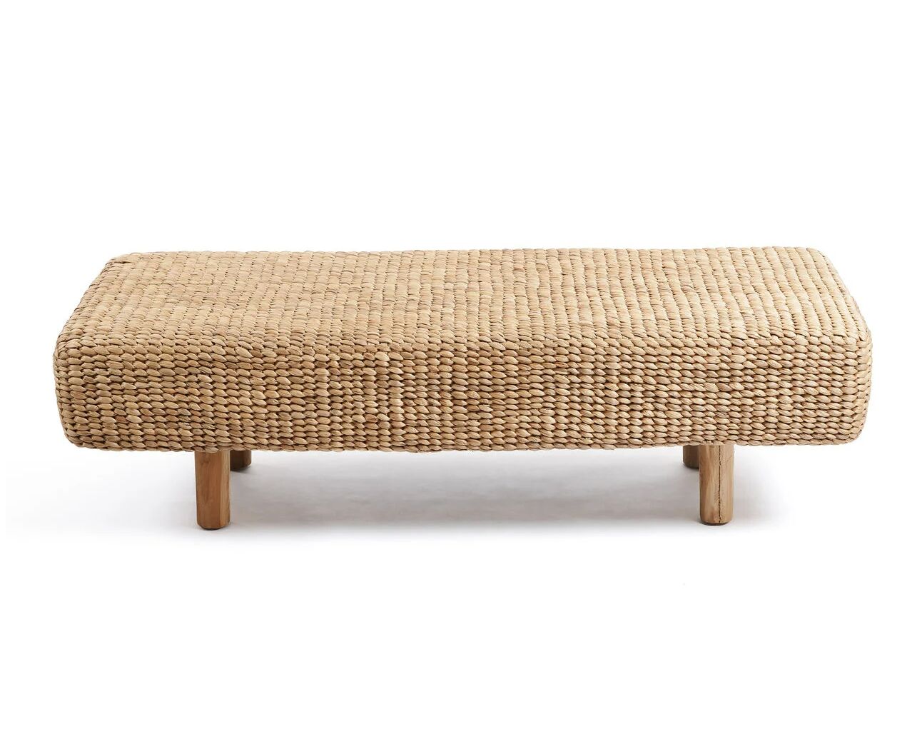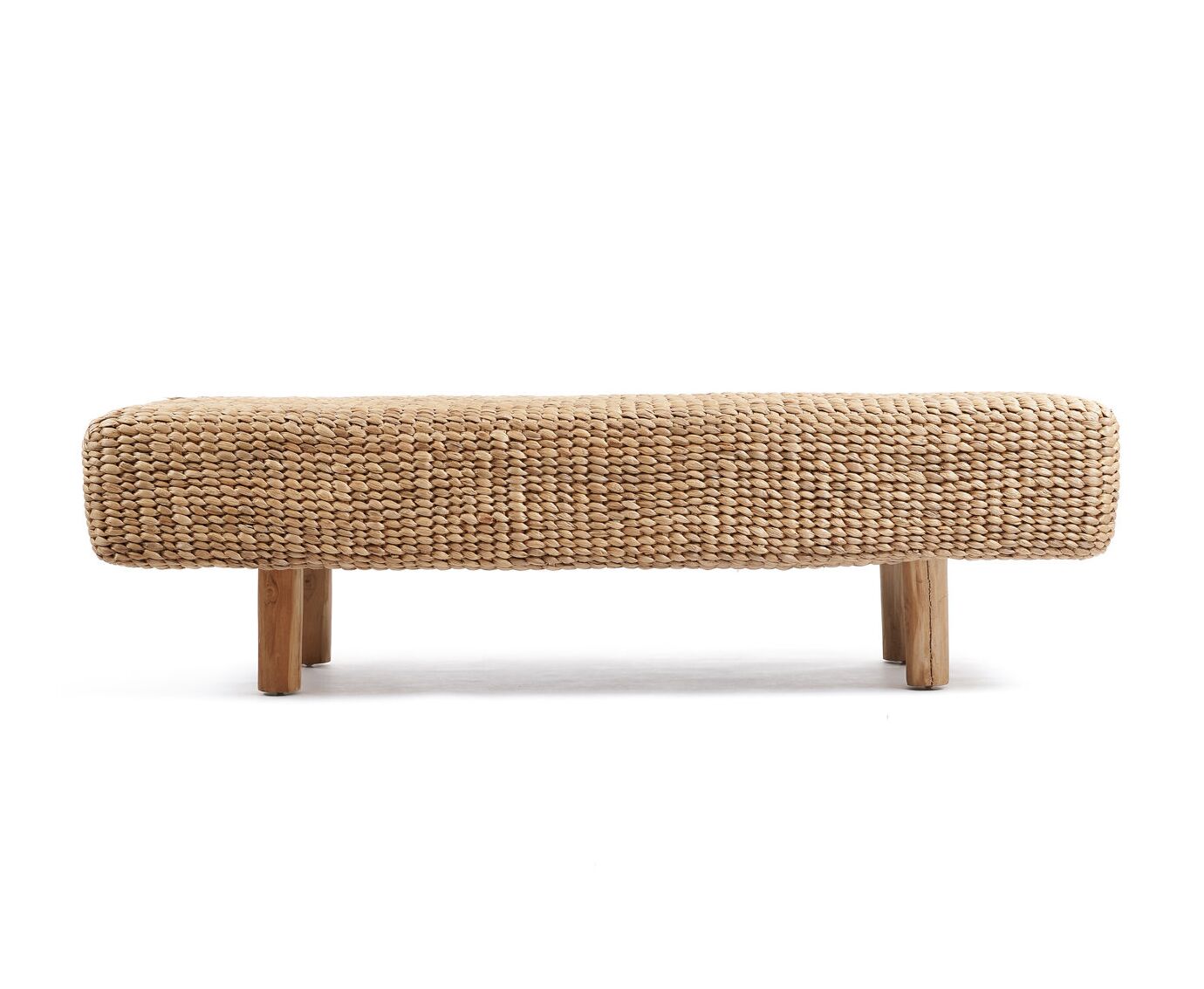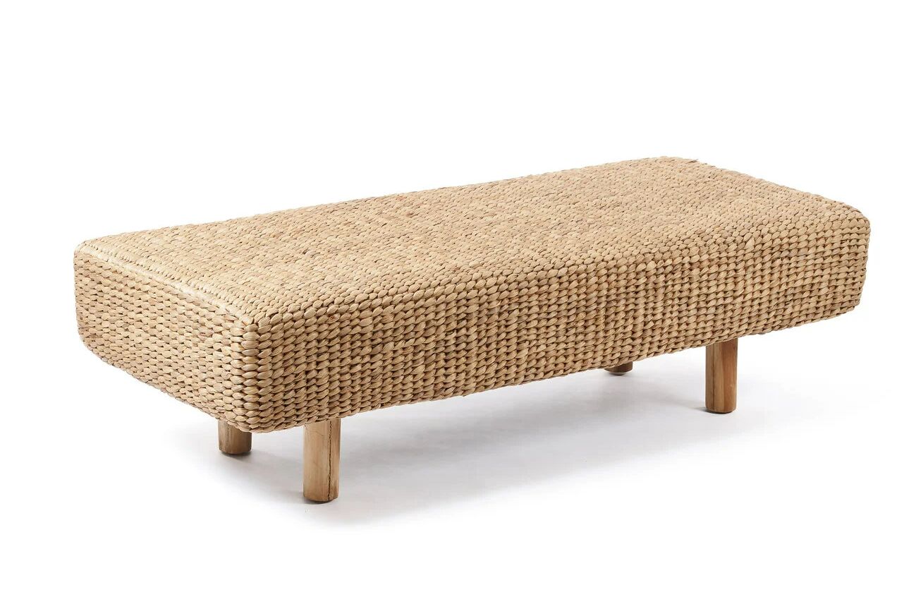 En elegant bænk i håndflettet vandhyacint, skabt med en blød og organisk form, hvor det naturlige materiale tilfører varme og tekstur til indretningen