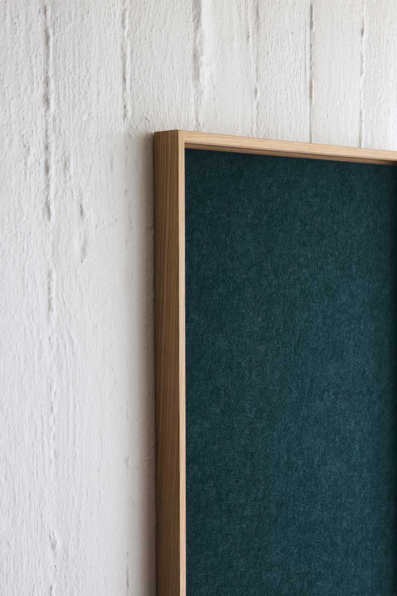 Opslagstavlen er fremstillet af lydabsorberende filt lavet af genanvendte plastikflasker og indrammet i massiv eg. Det enkle design passer naturligt ind i moderne kontormiljøer og bidrager til både et bedre lydmiljø og en visuel ro i indretningen.