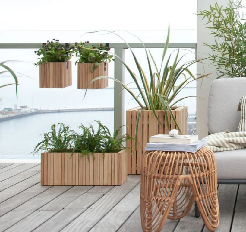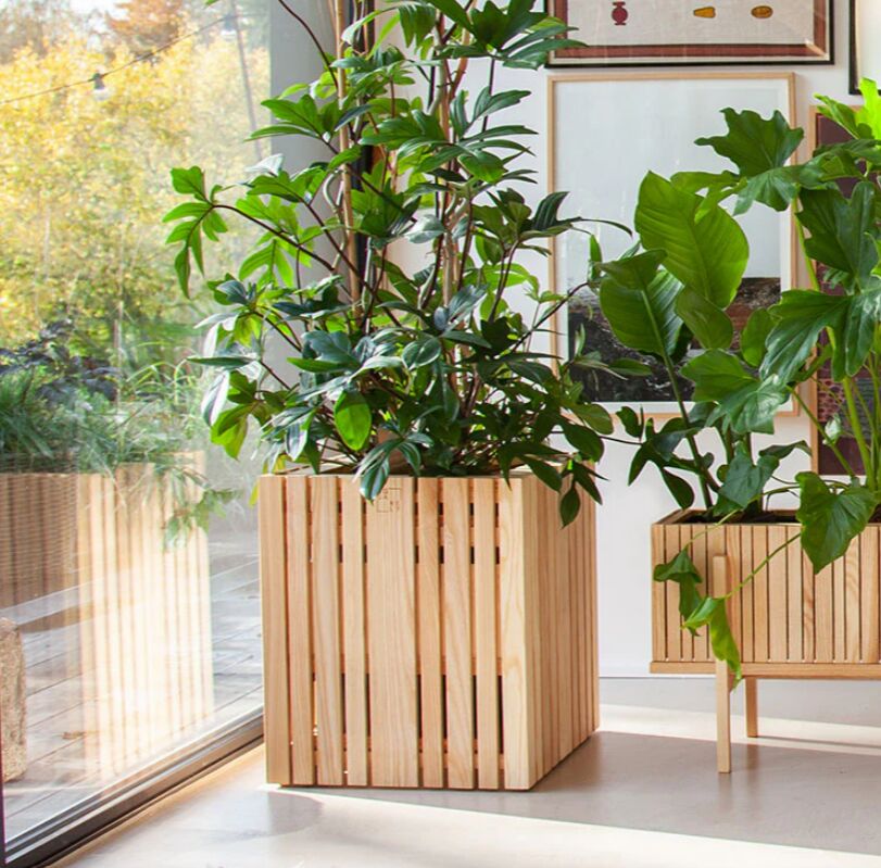 De lodrette paneler i olieret mørk eg giver et elegant og naturligt udtryk og passer ind i moderne og klassiske miljøer. Den kvadratiske form gør plantekassen fleksibel; den kan stå frit, anvendes som rumdeler eller placeres på hjul for nem flytning mellem zoner. Den kan benyttes både indendørs og udendørs.