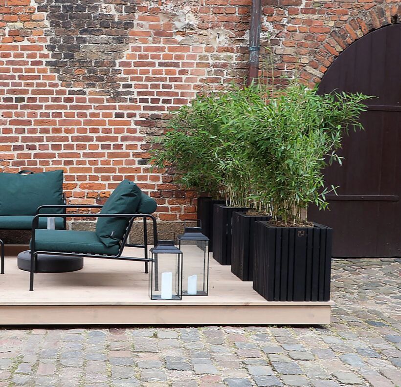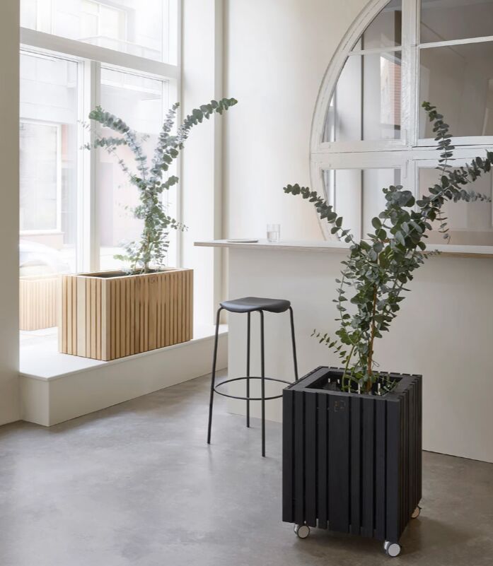 De lodrette paneler i olieret mørk eg giver et elegant og naturligt udtryk og passer ind i moderne og klassiske miljøer. Den kvadratiske form gør plantekassen fleksibel; den kan stå frit, anvendes som rumdeler eller placeres på hjul for nem flytning mellem zoner. Den kan benyttes både indendørs og udendørs.